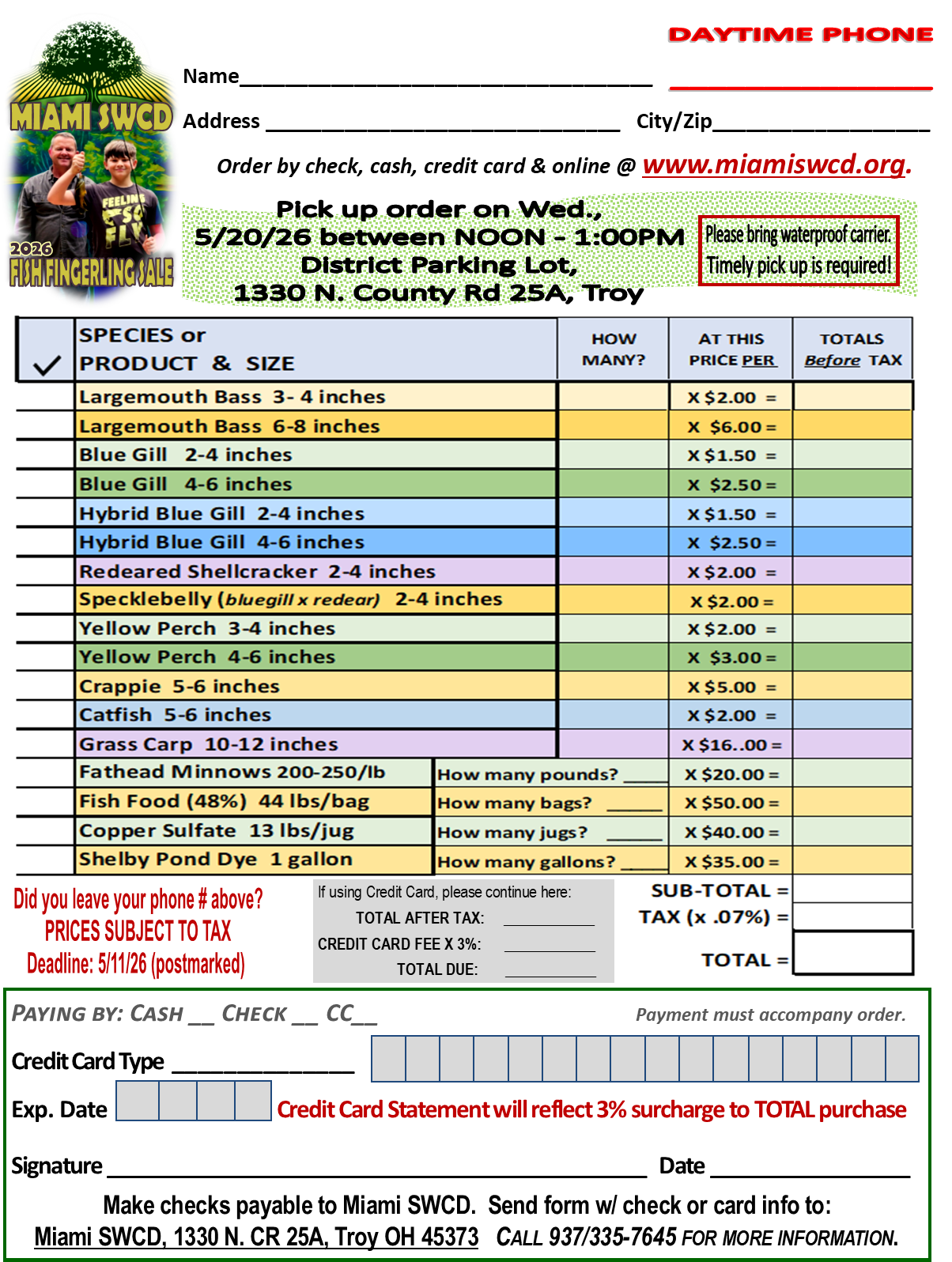 View Larger Image 2026 Fish Fingerling Sale Fish Fingerlings will be available for pick up in the District parking lot on May 20th between noon and 1pm. Linda Raterman2026-04-02T14:41:31+00:00April 2, 2026|Uncategorized| Share This Story! FacebookXLinkedInEmail